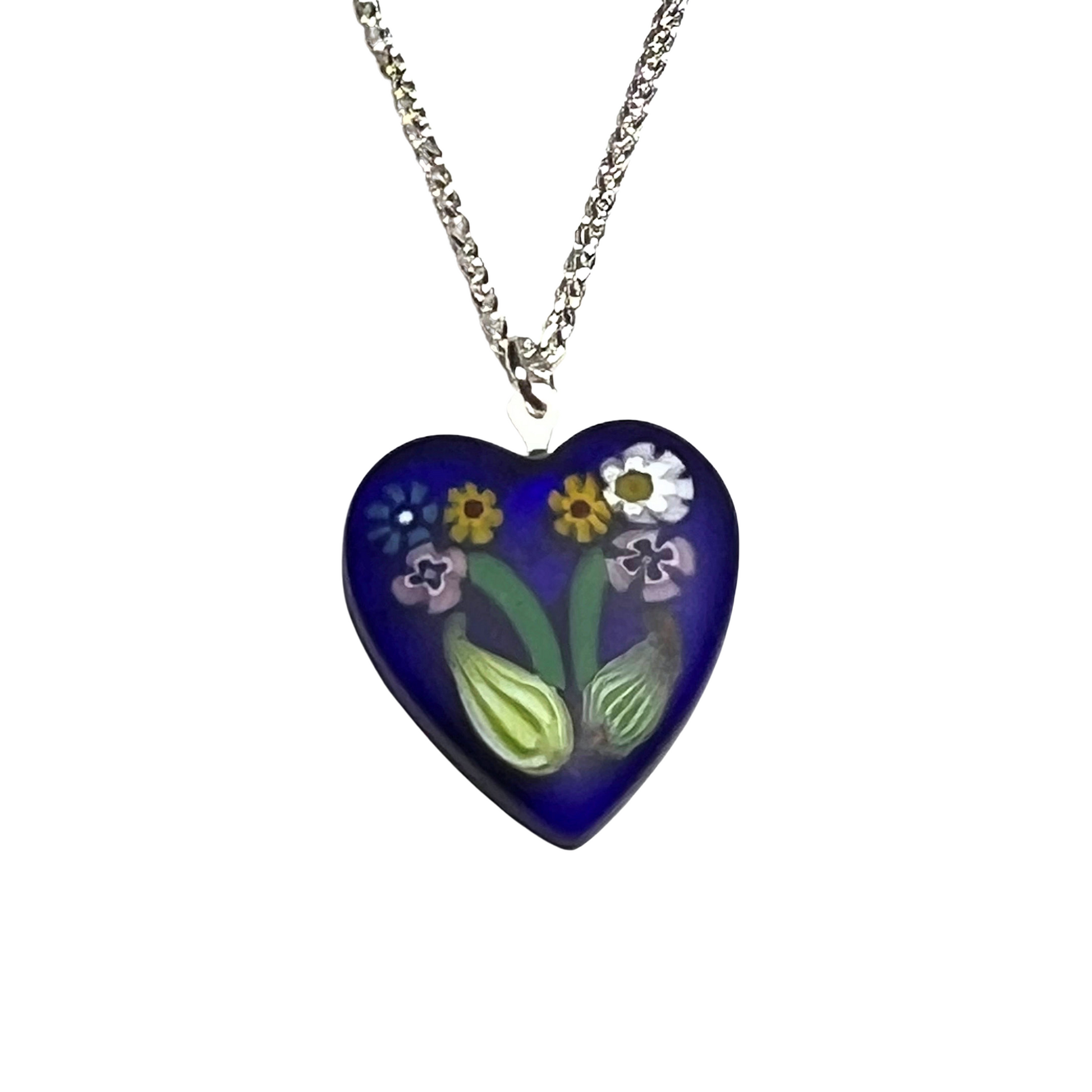Murano Dark Blue Millefiori Flower Heart Pendant Necklace