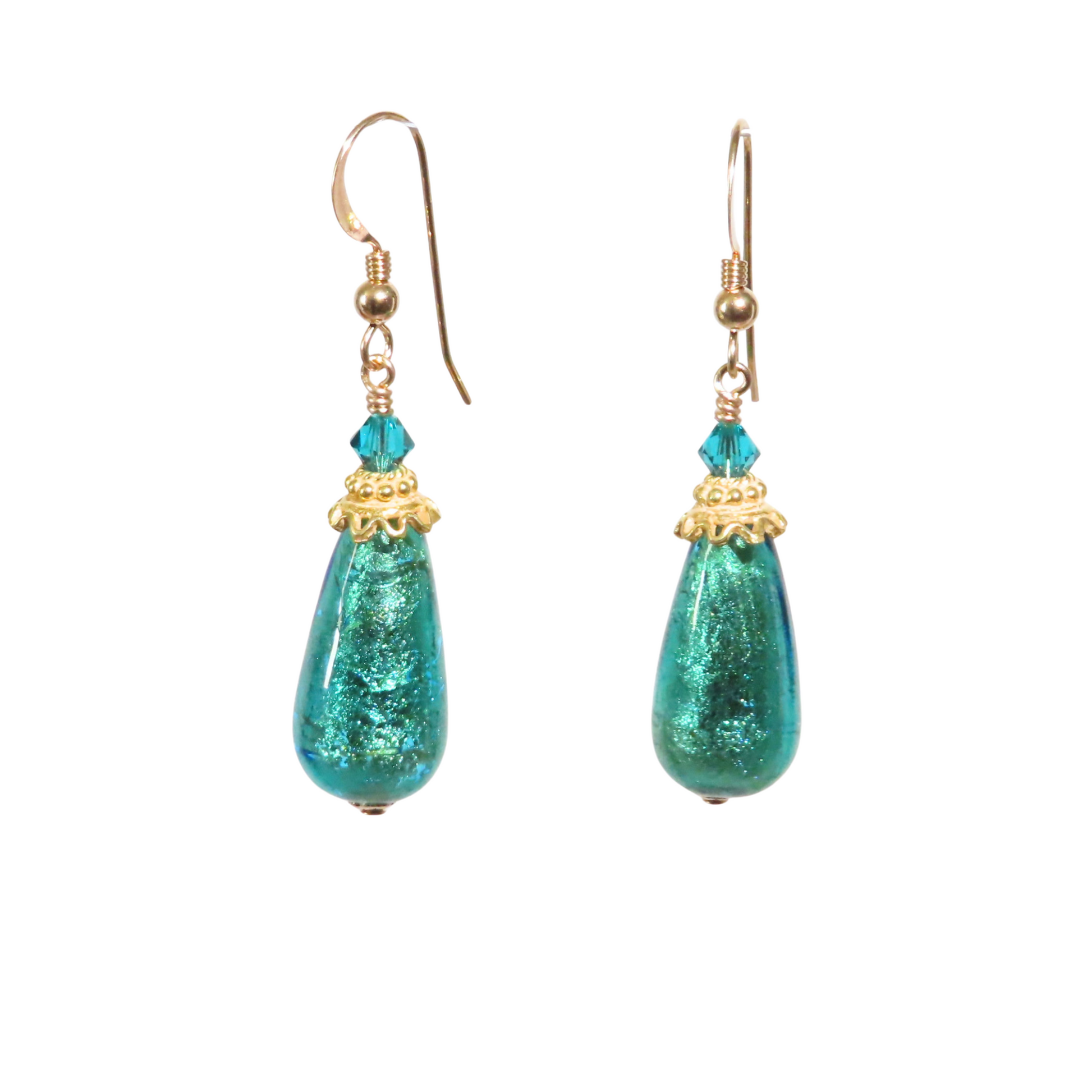Bring a touch of Venetian artistry to your collection with these stunning Murano glass earrings. Each 20mm x 10mm aqua green teardrop bead is handmade in Italy, infused with luminous color and finished with gold-filled wire and bead caps for a refined design. Accented with Swarovski crystals and gold vermeil beads, these earrings shimmer beautifully in the light, making them the perfect accessory for both everyday elegance and special occasions.